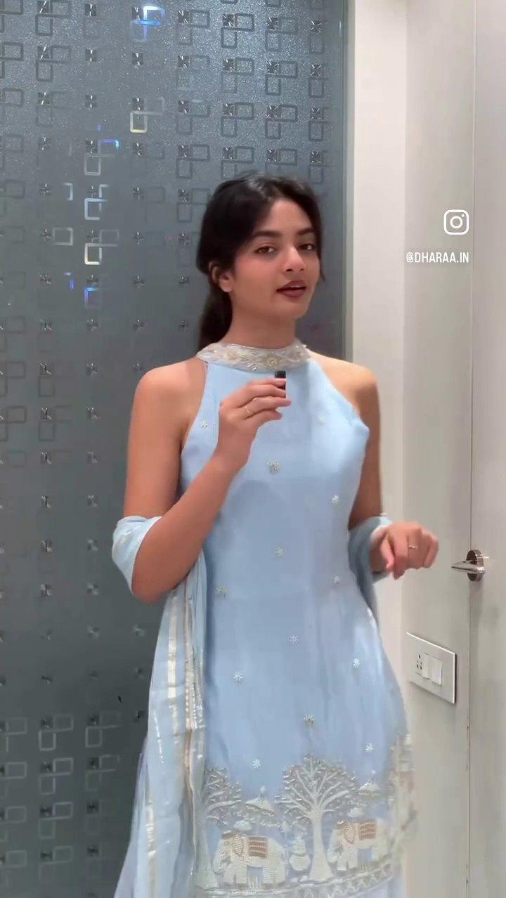 Got you the perfect ice-blue Indo-Western ?? A halter-neck silhouette with a beautifully hand-worked kurti—effortlessly elegant.