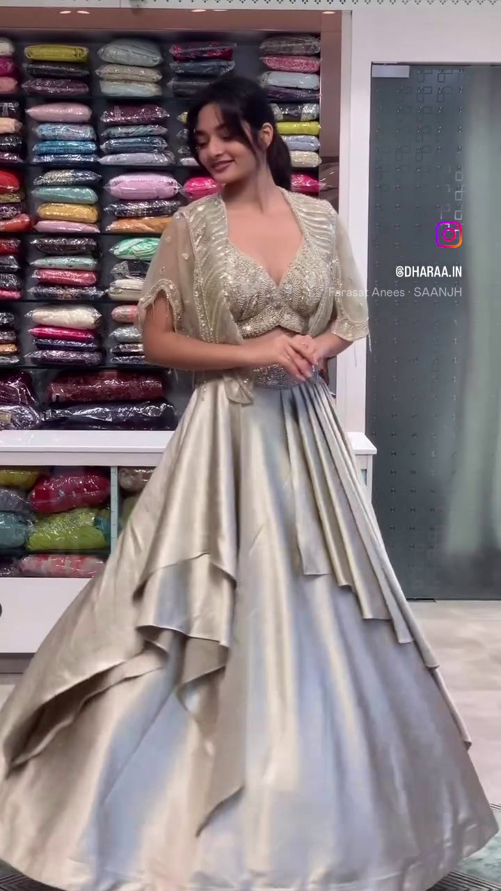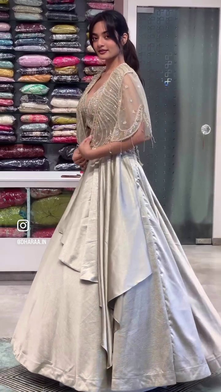 This exquisite champagne gold lehenga set features a heavily embroidered deep-V choli, a sheer embellished jacket, and a luxurious shimmering full skirt. Perfect for making a dazzling statement at weddings and festive occasions, its intricate detailing promises elegance and grandeur. | Video taken on: Dec 11, 2025, 6:43:28?PM UTC