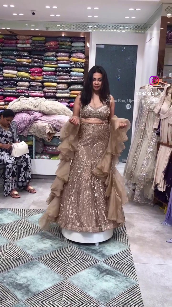 This exquisite champagne sequin lehenga set features intricate all-over embellishments on its flared skirt and matching sweetheart-neck blouse. It’s elegantly paired with a dramatic ruffled dupatta, creating a perfect blend of modern style and traditional grandeur for festive occasions. | Video taken on: Dec 11, 2025, 6:41:26?PM UTC