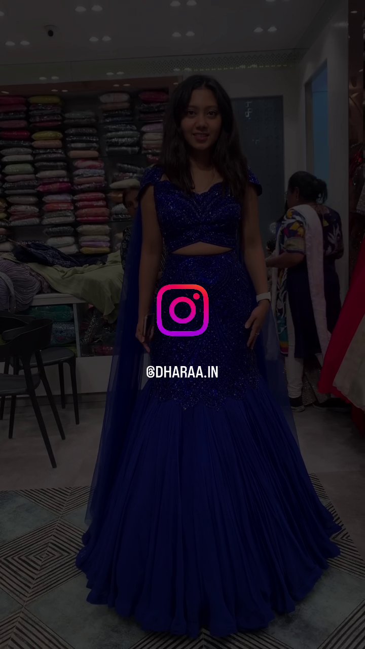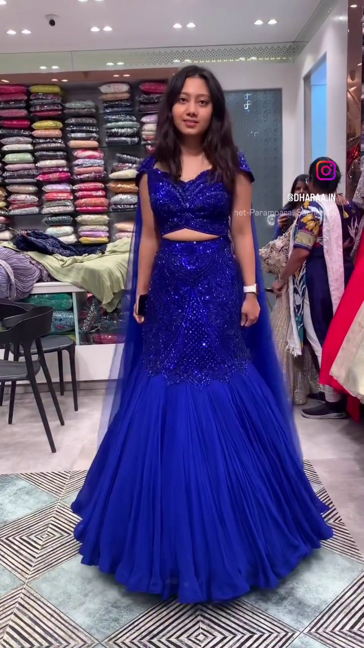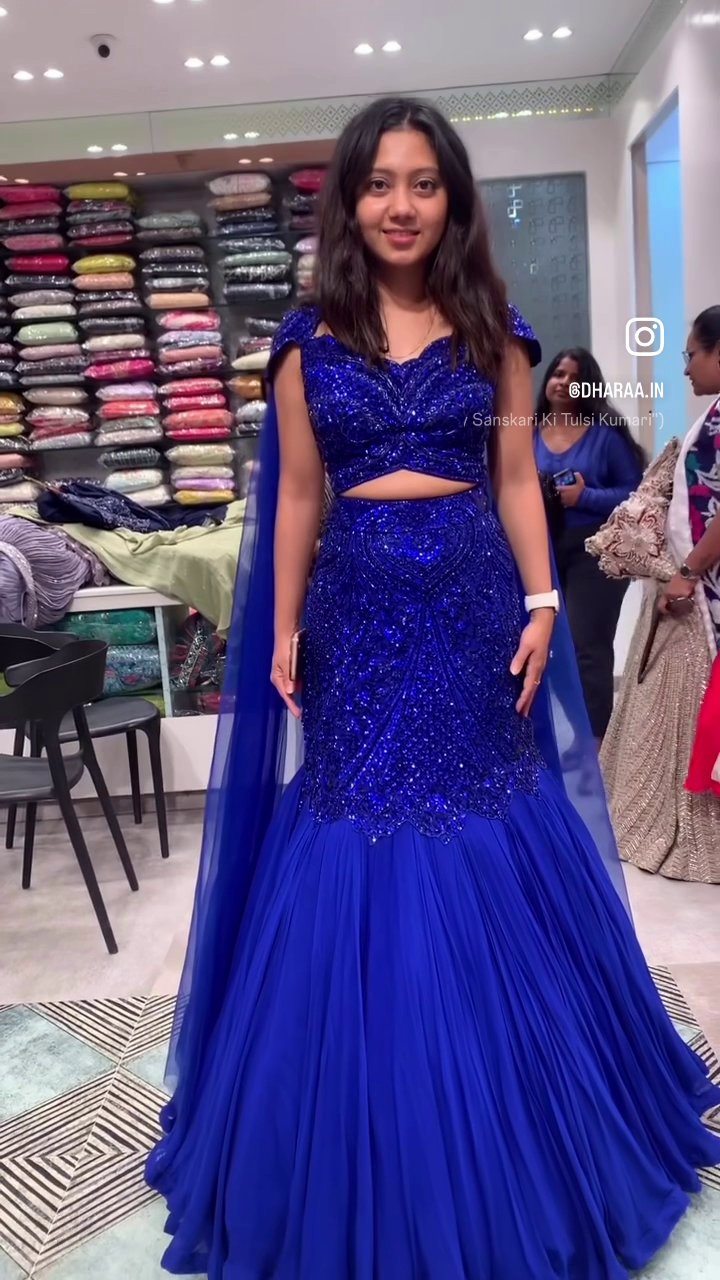 This stunning royal blue ensemble features a heavily sequined crop top with elegant cap sleeves, paired with a matching mermaid-style skirt. Adorned with intricate beadwork and a dramatic flared hem, it’s perfect for making a glamorous statement at any upscale event or celebration. | Video taken on: Dec 11, 2025, 6:57:29?PM UTC