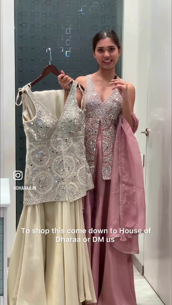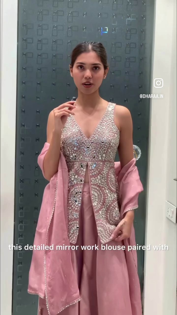 This elegant dusty rose palazzo suit features a heavily mirror-embellished V-neck sleeveless top with a stylish front slit, perfectly complemented by flowing palazzo pants and a matching sheer dupatta accented with delicate tassels. Ideal for festive occasions and celebrations, this ensemble blends traditional artistry with modern flair. | Video taken on: Dec 11, 2025, 6:46:58?PM UTC