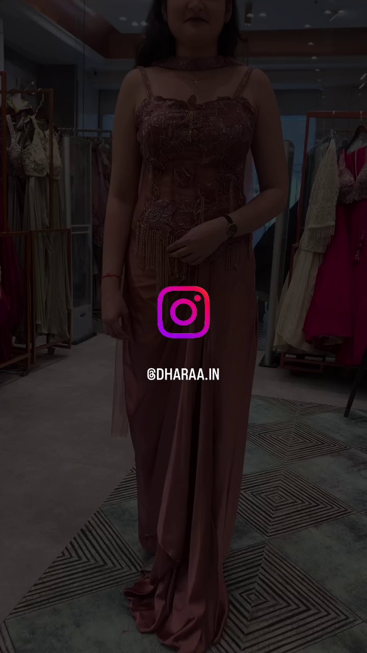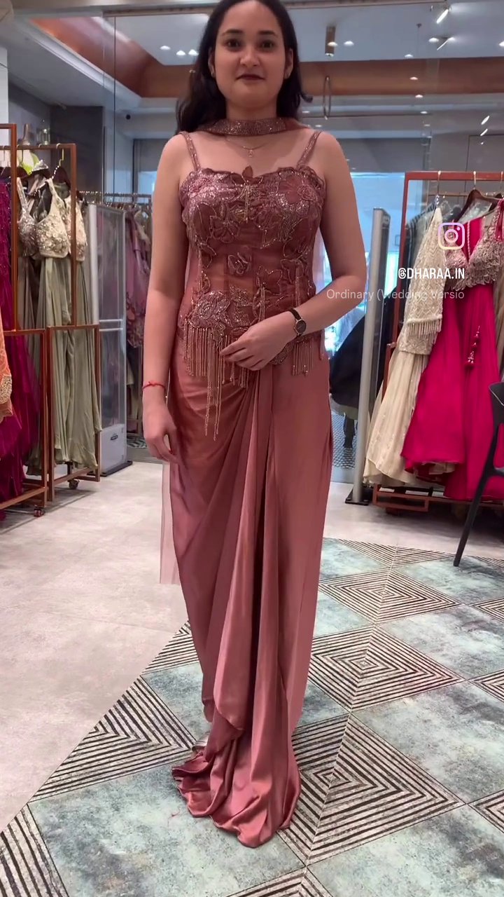 Experience elegance with this stunning saree-gown featuring intricate embellishments on a sheer bodice and a flowing chiffon skirt. The delicate beadwork and charming fringe details add a touch of glamour, making it perfect for festive occasions and weddings. | Video taken on: Dec 11, 2025, 7:01:09?PM UTC