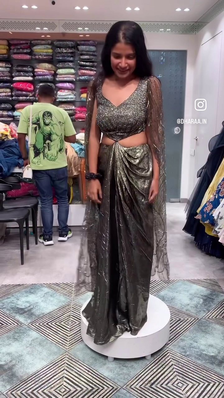 This exquisite pre-draped saree gown features a heavily embellished V-neck blouse with elegant sheer cape sleeves and a contemporary waist cut-out. Its luxurious textured fabric in a sophisticated charcoal hue and modern silhouette offer effortless sophistication, making it ideal for elegant parties and special occasions. | Video taken on: Dec 11, 2025, 6:47:04?PM UTC