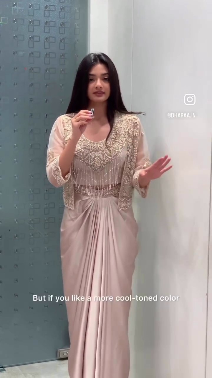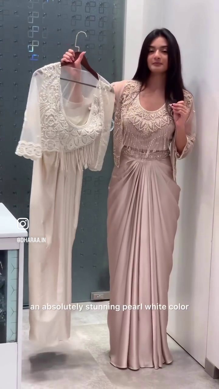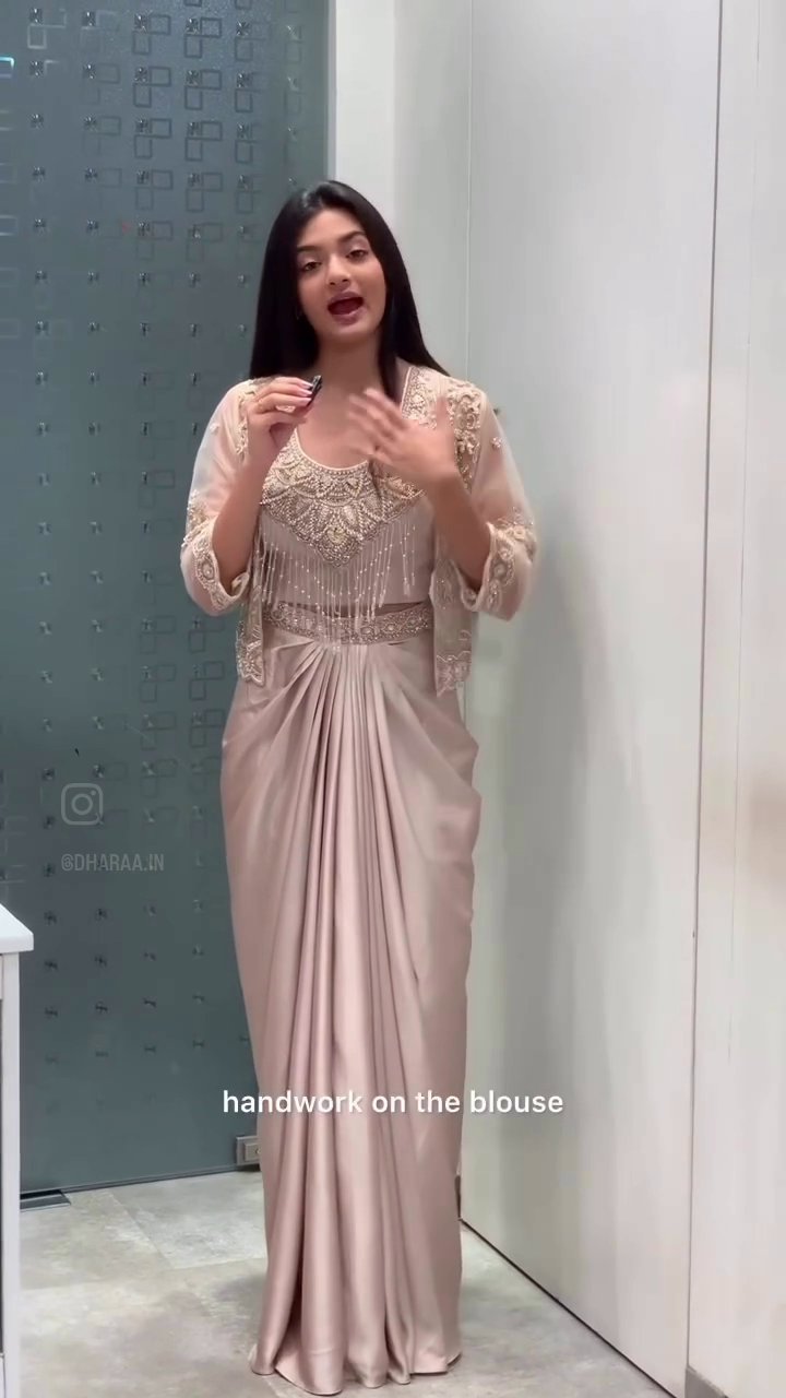 This elegant saree features a luxurious drape with intricate embellishments on the blouse and a matching jacket, offering a sophisticated and modern take on traditional Indian wear. Its graceful silhouette and detailed craftsmanship make it a stunning choice for special occasions. | Video taken on: Dec 11, 2025, 6:44:44?PM UTC