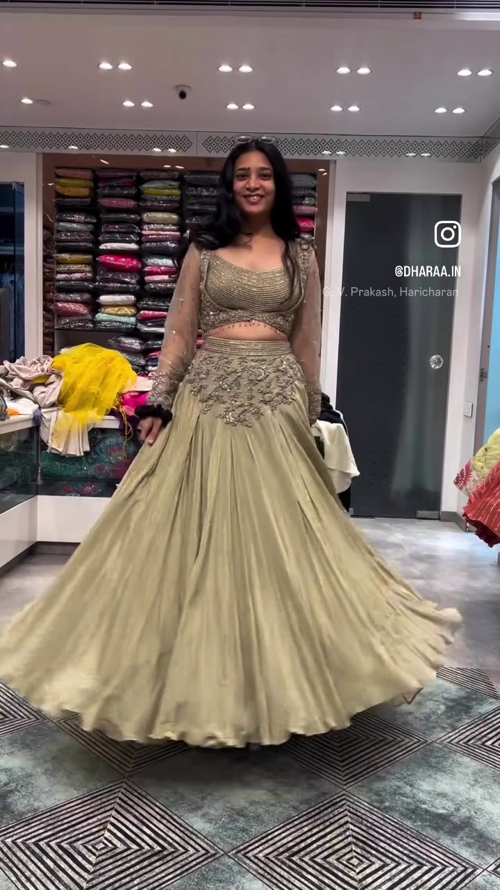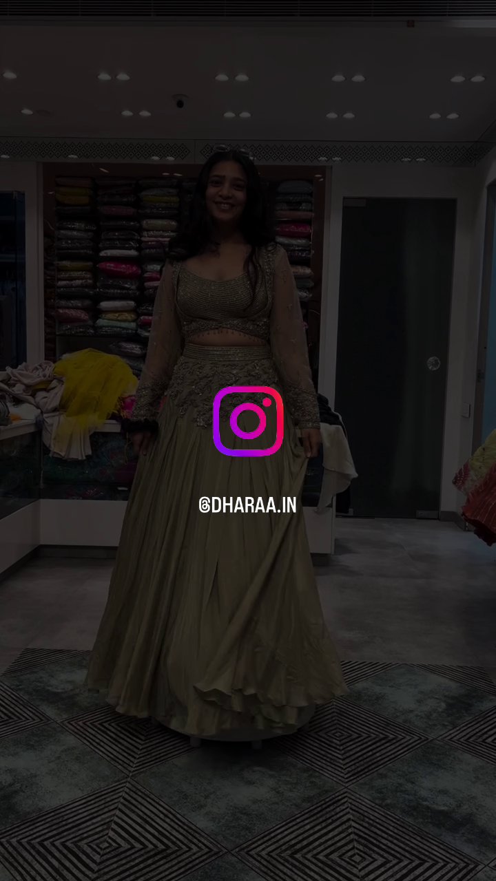 This exquisite olive green lehenga choli set features a dazzling crop top with intricate sequin and bead embellishments on the bodice and sheer sleeves. Complementing the top, the voluminous, flowing skirt is accented with delicate embroidery at the waist, creating a stunning and elegant look perfect for festive occasions and celebrations. | Video taken on: Dec 11, 2025, 6:53:09?PM UTC