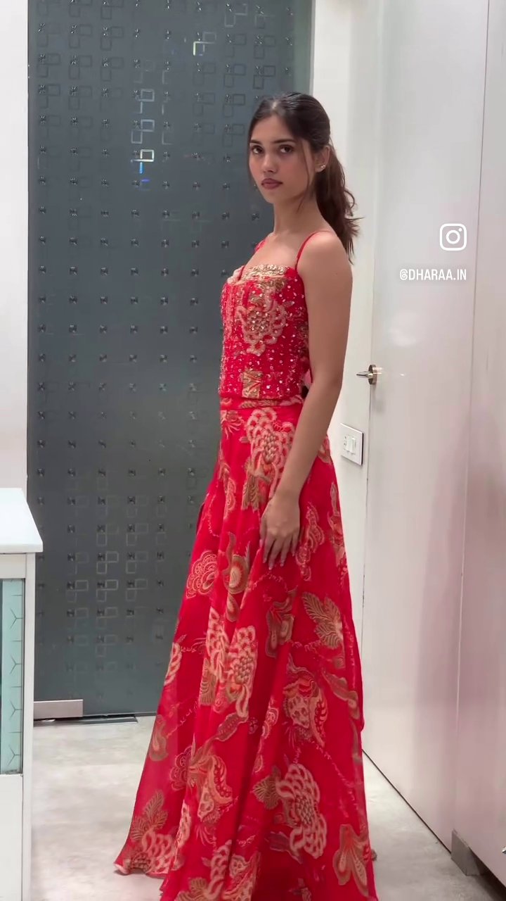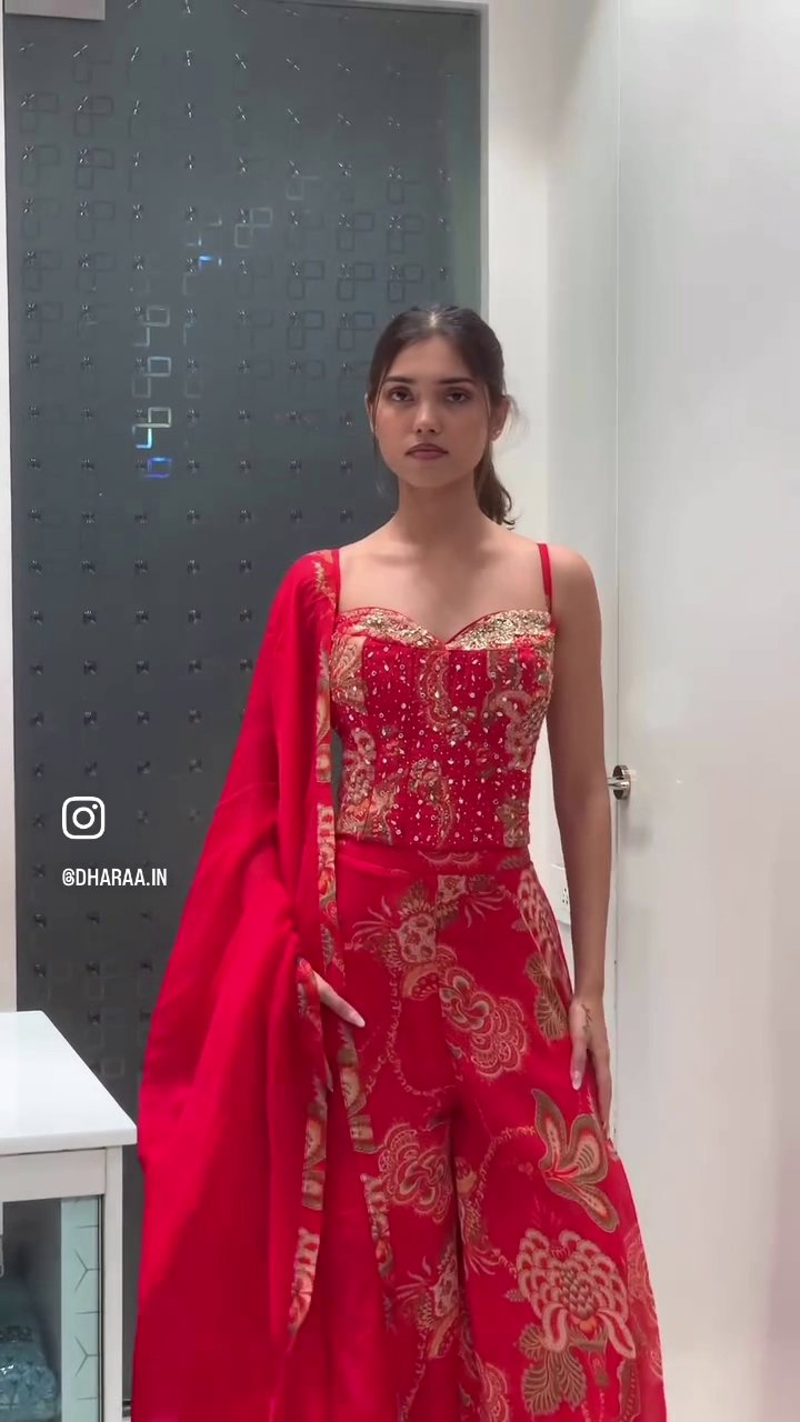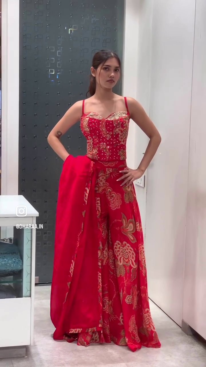 This stunning red palazzo suit features a beautifully embellished sweetheart neckline bodice and matching palazzo pants adorned with an intricate gold floral print. Complete with a flowing dupatta, this ensemble offers a luxurious and festive look perfect for special occasions. | Video taken on: Dec 11, 2025, 6:44:30?PM UTC