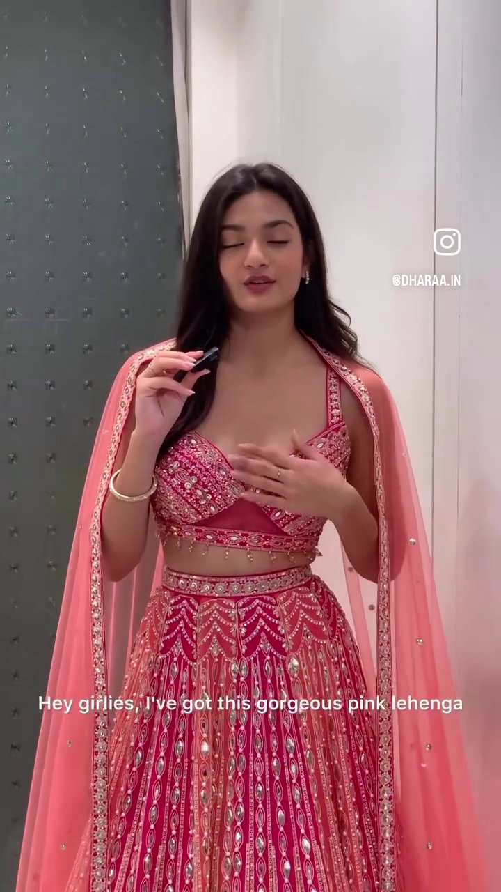 This exquisite ensemble features a vibrant pink silk lehenga intricately embellished with silver thread work and sparkling sequins, paired with a matching choli and a sheer coral dupatta. It’s perfect for festive occasions and celebrations, offering a blend of traditional craftsmanship and contemporary style. | Video taken on: Dec 11, 2025, 6:44:34?PM UTC