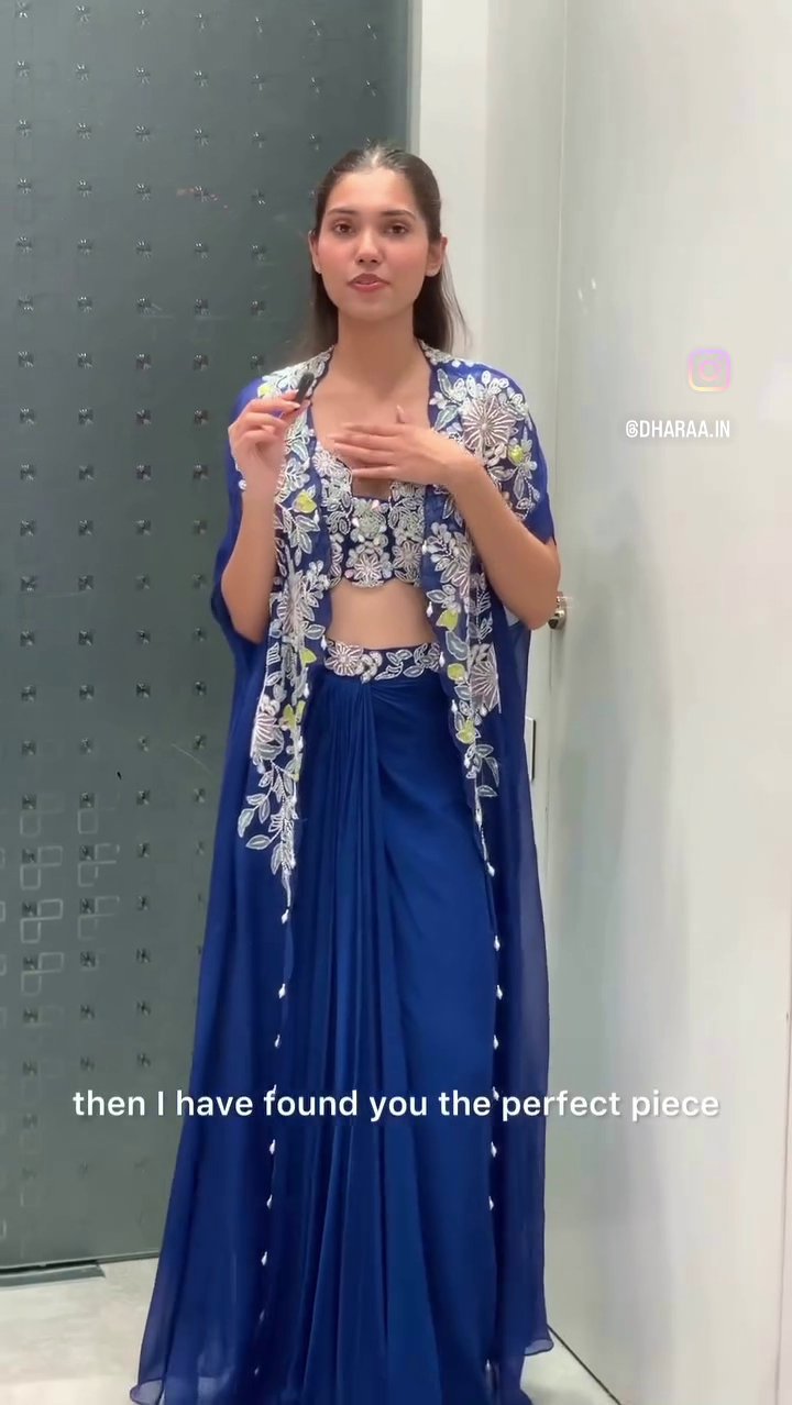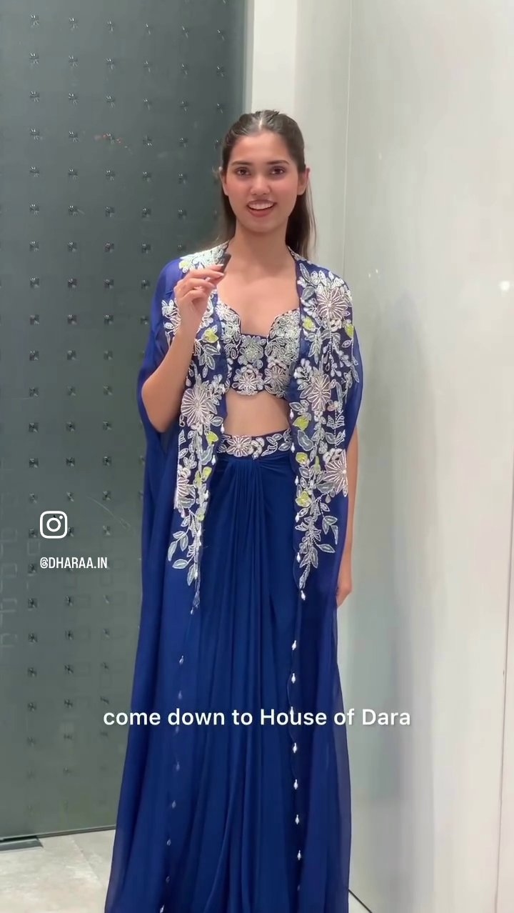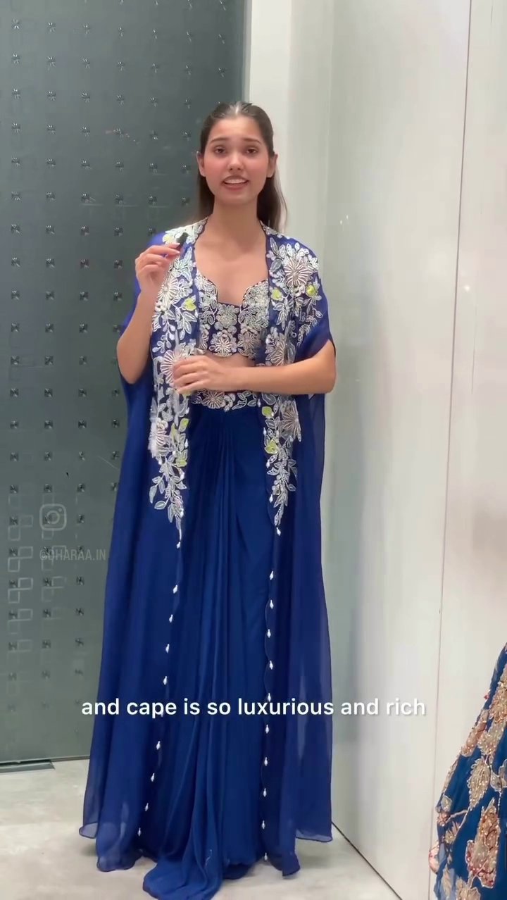 This elegant royal blue palazzo set features a beautifully embroidered crop top and a flowing, ornate cape, perfect for making a luxurious statement at any festive event. The intricate floral detailing and soft, draping fabric ensure both style and comfort. | Video taken on: Dec 11, 2025, 6:42:27?PM UTC