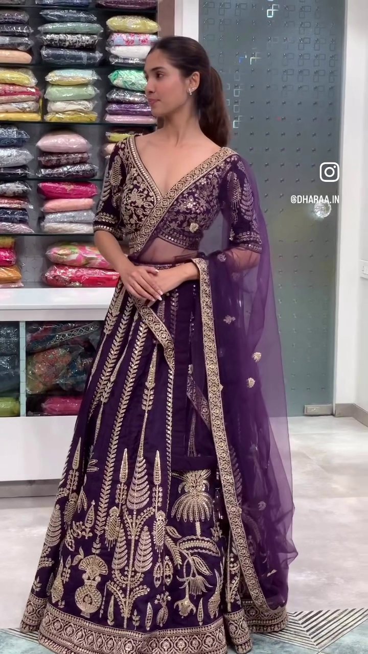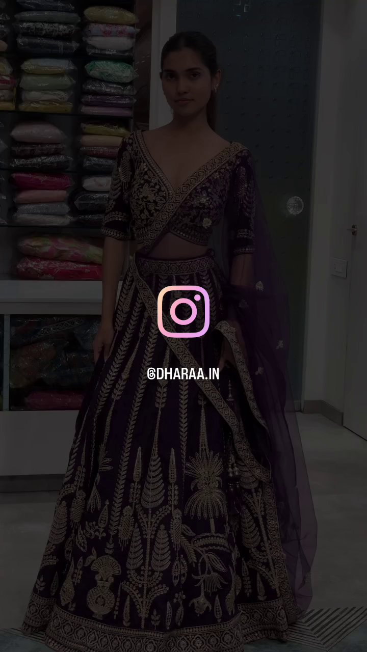 This exquisite purple lehenga set features intricate gold embroidery on a rich fabric, perfect for special occasions and cultural events. The set includes a beautifully crafted lehenga skirt, a matching blouse, and a sheer dupatta, offering a complete and elegant ensemble. | Video taken on: Dec 11, 2025, 6:54:38?PM UTC