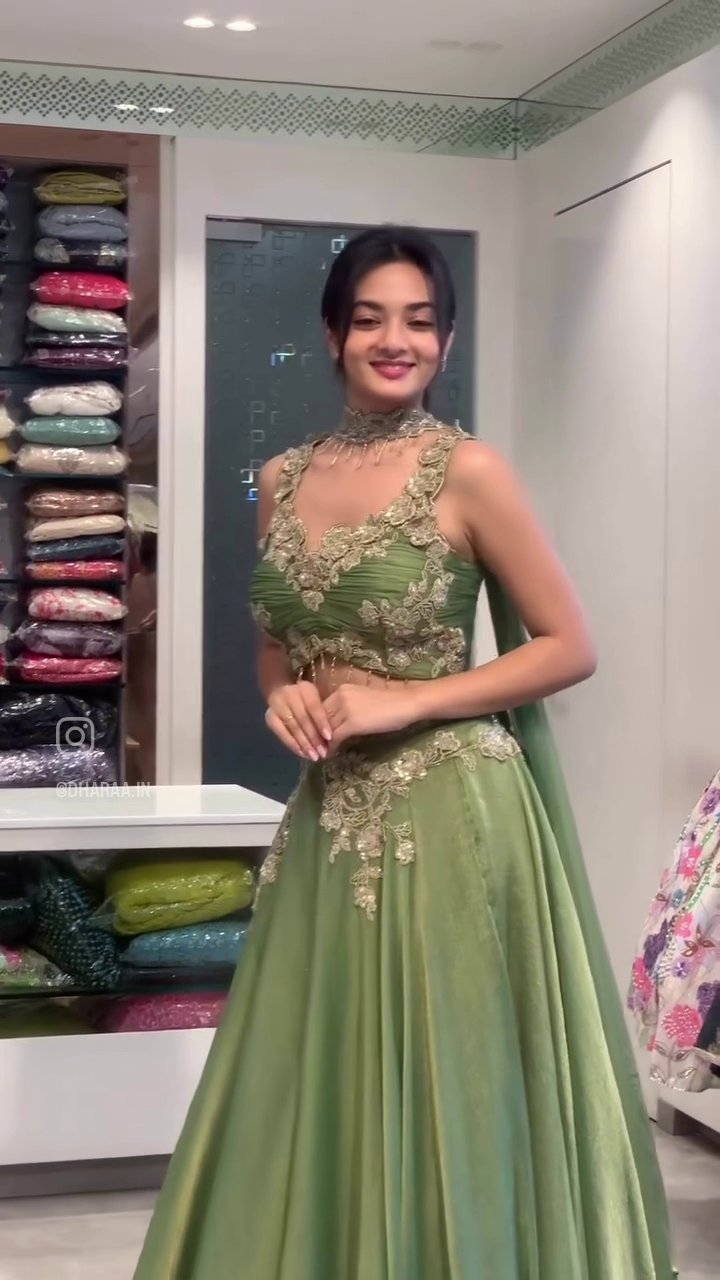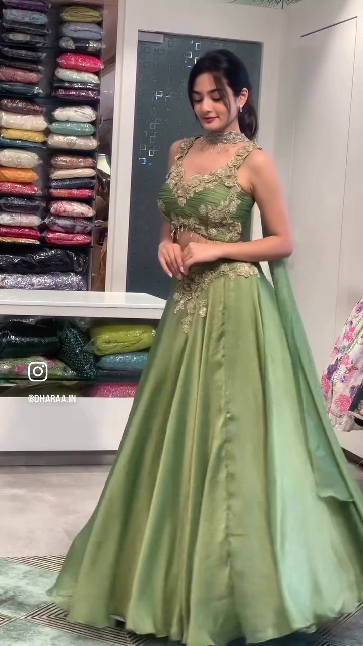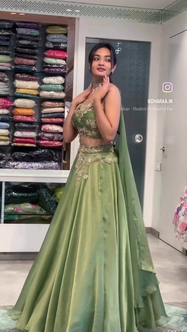 This elegant sage green lehenga set features intricate golden embroidery adorning the sleeveless choli and voluminous skirt. Designed for festive occasions and celebrations, its rich detailing and graceful silhouette offer a stunning blend of tradition and modern style. | Video taken on: Dec 11, 2025, 6:45:10?PM UTC