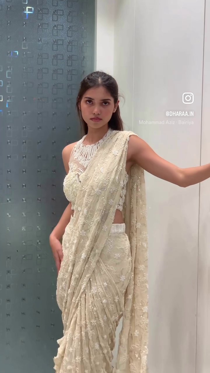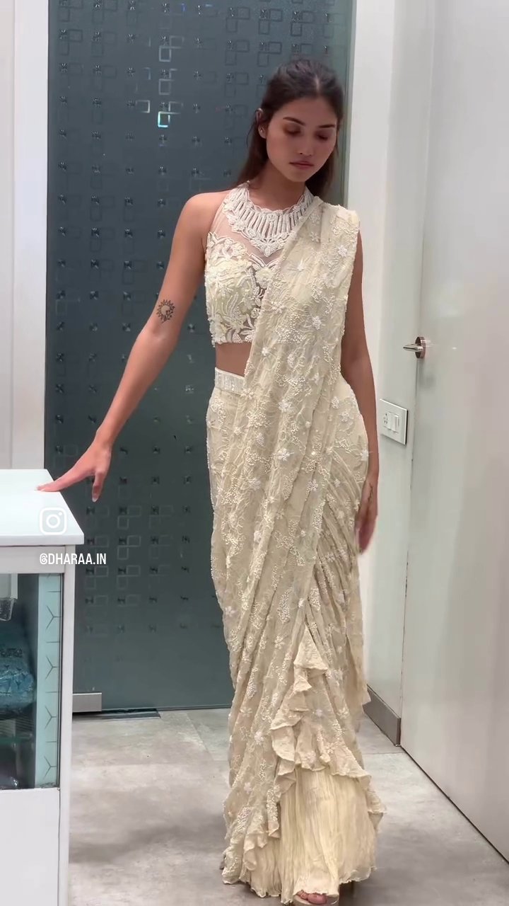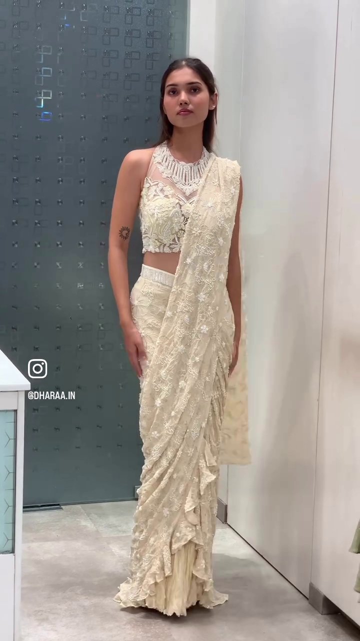 This exquisite ivory sari features intricate floral embroidery and delicate beading throughout, paired with a matching sleeveless blouse and a statement necklace. Its cascading ruffles and elegant design make it a perfect choice for special occasions and formal events. | Video taken on: Dec 11, 2025, 6:41:45?PM UTC