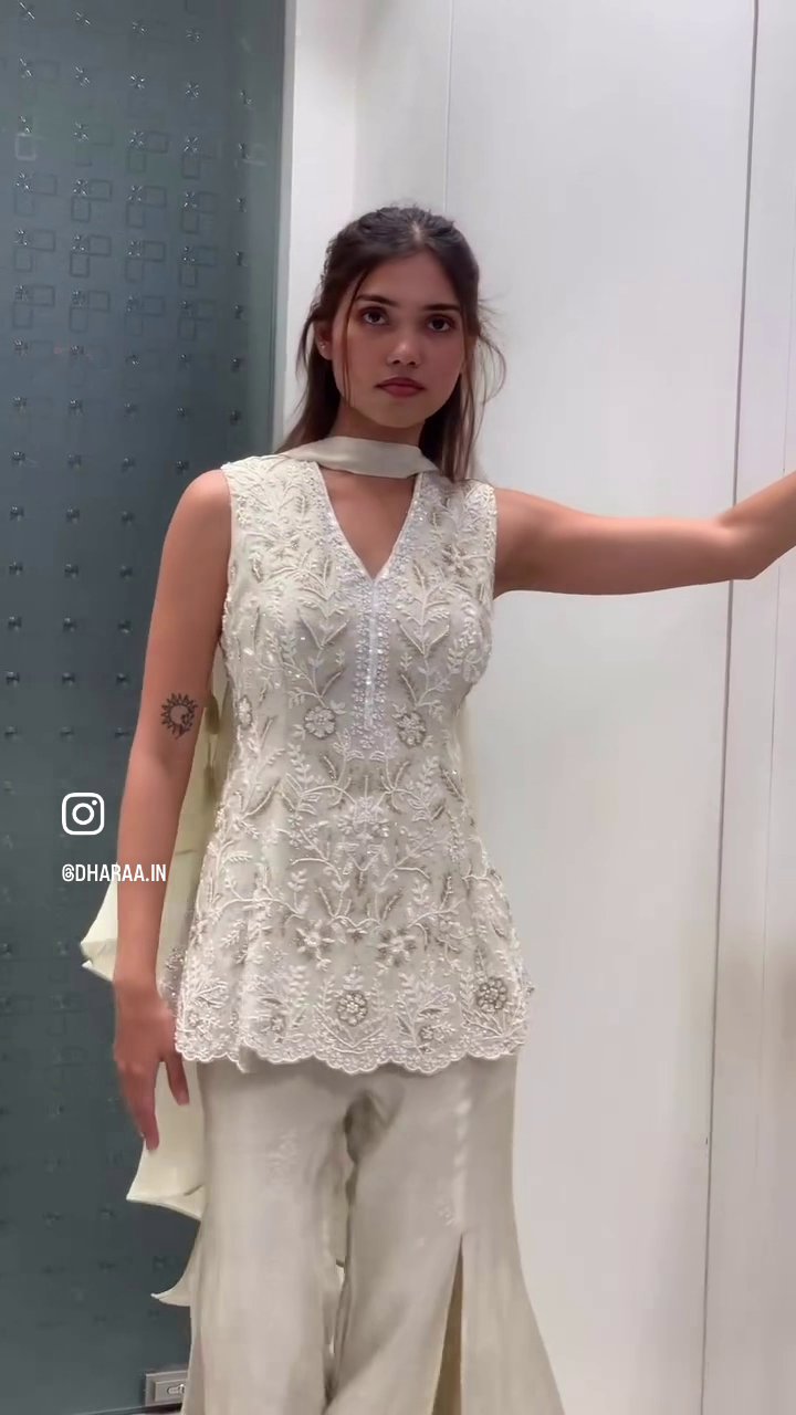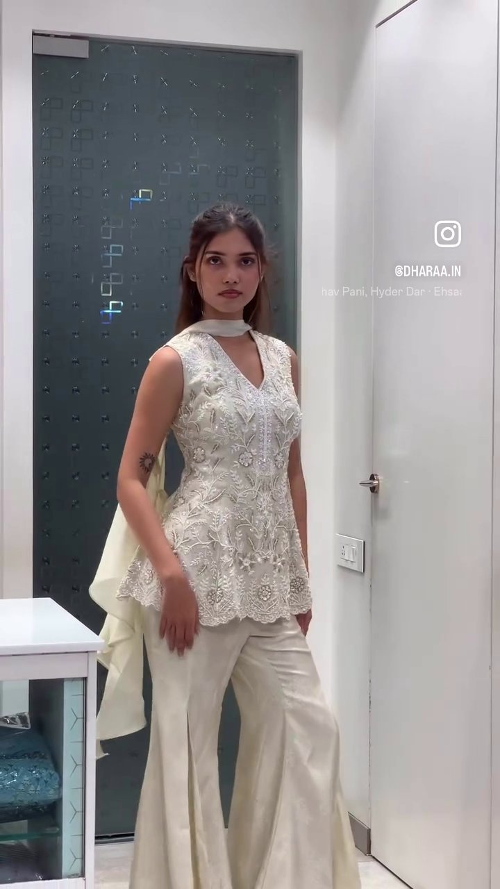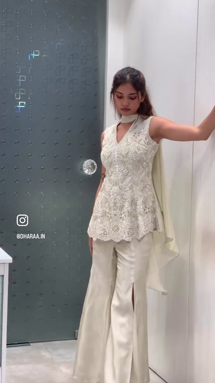 This elegant ivory ensemble features a sleeveless V-neck peplum top adorned with exquisite intricate embroidery and sparkling embellishments, beautifully complemented by matching wide-leg sharara pants with a chic side slit. Perfect for festive occasions and celebrations, this luxurious outfit offers a blend of traditional craftsmanship and contemporary style for a captivating look. | Video taken on: Dec 11, 2025, 6:47:18?PM UTC