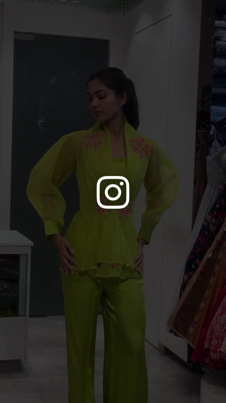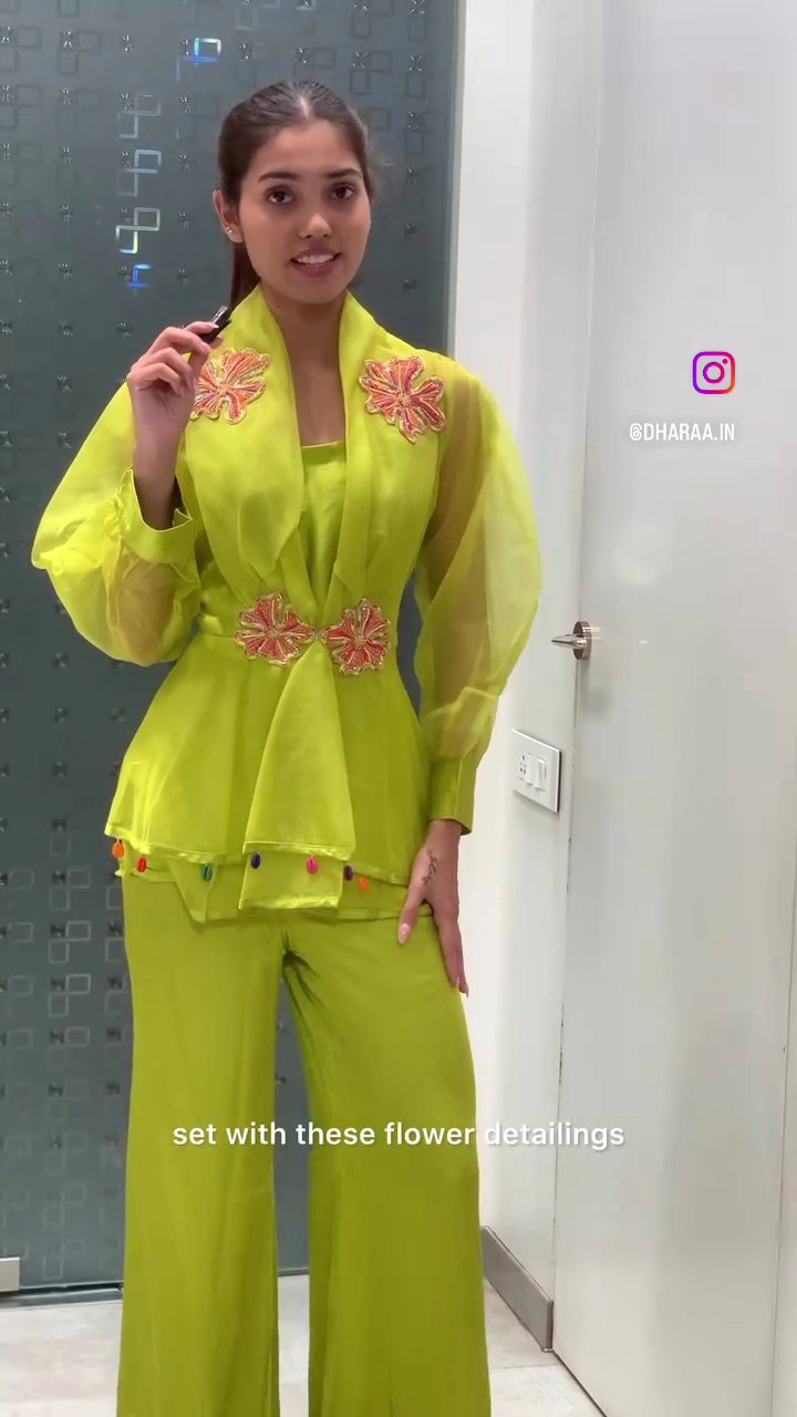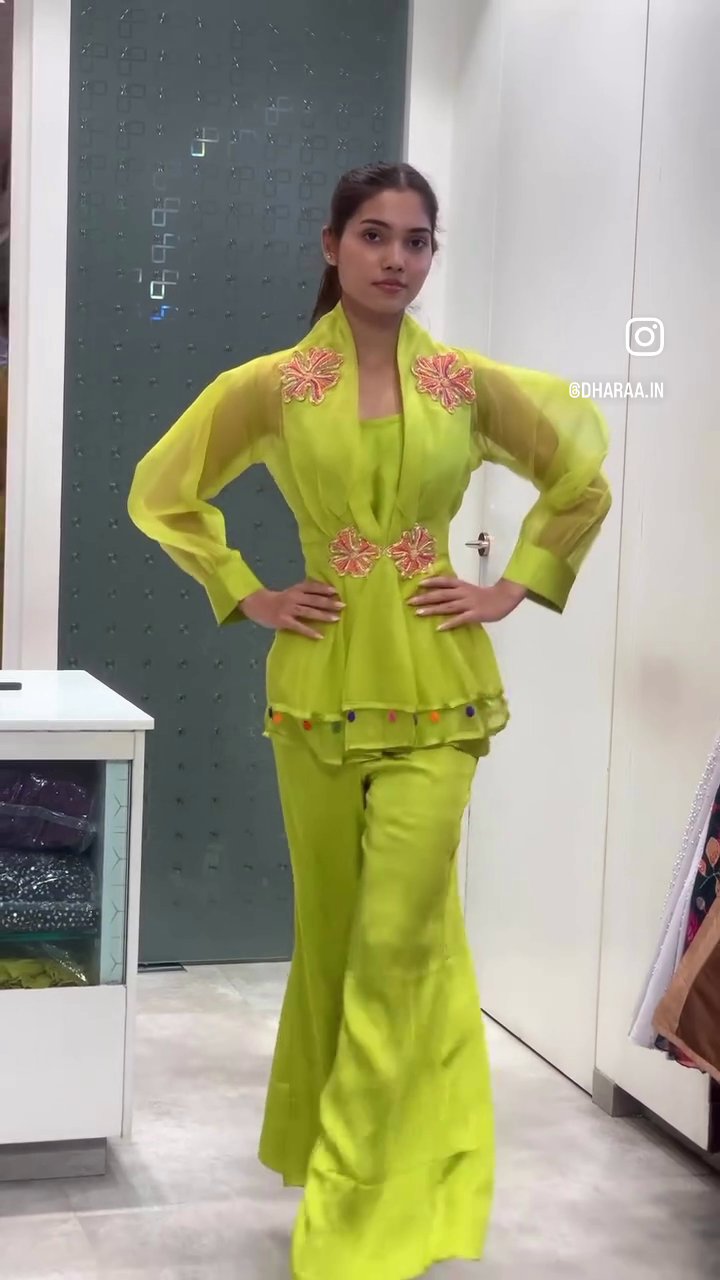 Elevate your style with this vibrant lime green palazzo suit, featuring delicate floral embroidery on the peplum jacket and flared trousers for a sophisticated, festive look. The sheer organza overlay and playful tassel trim add an element of modern elegance and charm. | Video taken on: Dec 11, 2025, 7:00:27?PM UTC