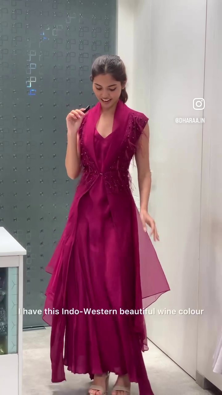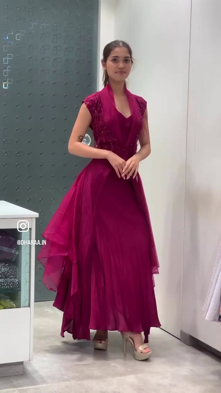 This elegant magenta gown features a flowing silhouette and a sophisticated cape overlay adorned with intricate beading and delicate feather-like details. Perfect for festive occasions, its rich color and unique embellishments ensure a captivating and graceful presence. | Video taken on: Dec 11, 2025, 7:00:17?PM UTC