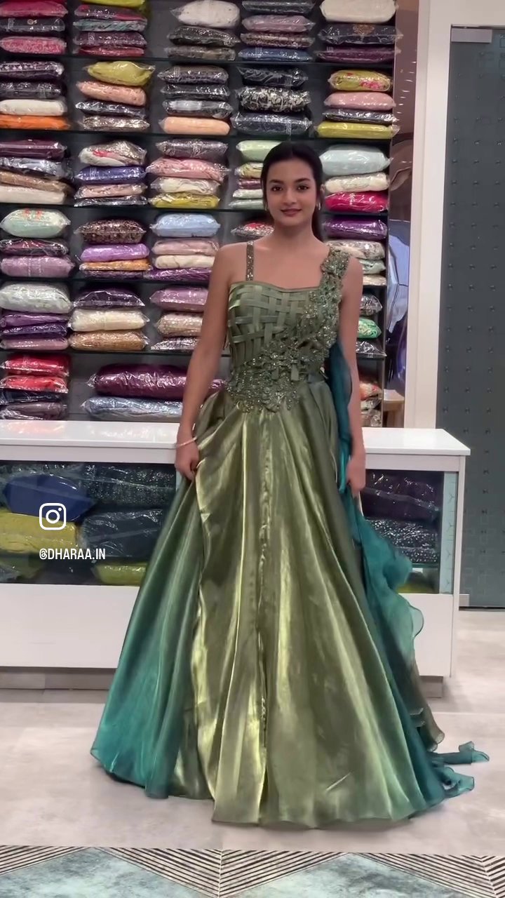 This stunning gown features a beautiful ombre transition from sage green to deep teal, complemented by a unique woven bodice with delicate embellishments. Its voluminous, flowing skirt creates an effortlessly elegant silhouette, perfect for making a grand entrance at any formal event or celebration. | Video taken on: Dec 11, 2025, 6:59:05?PM UTC