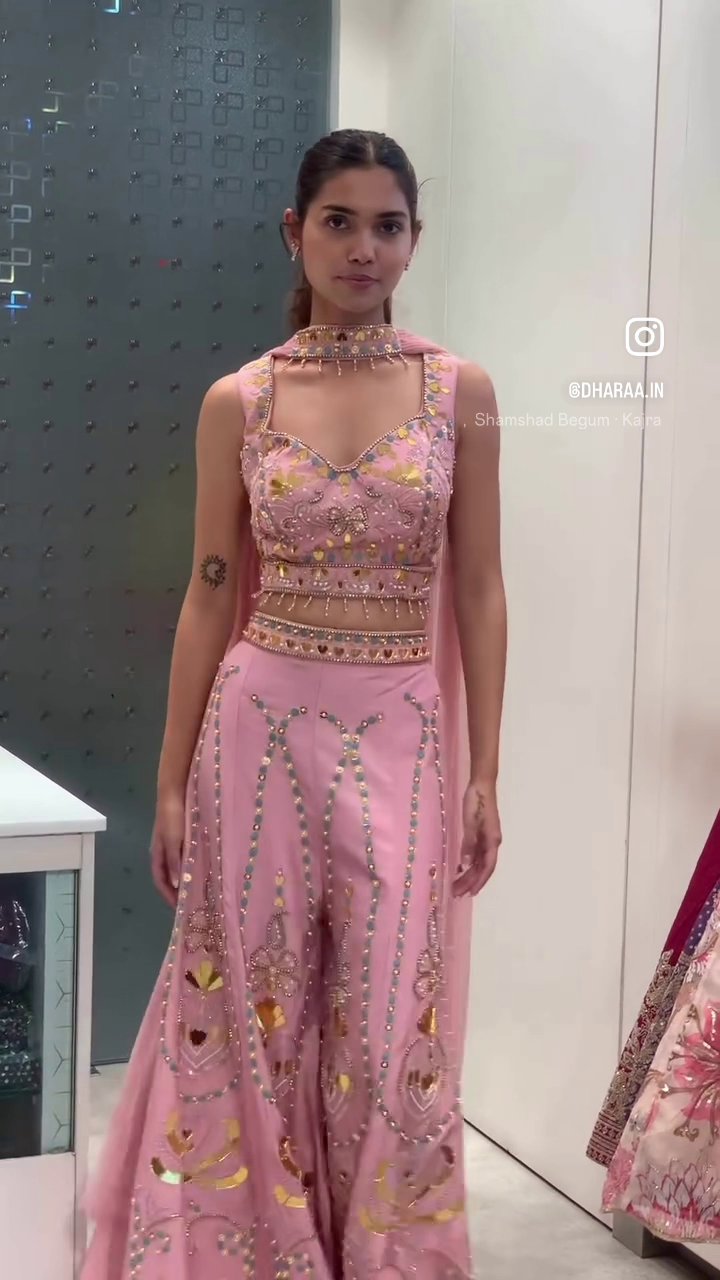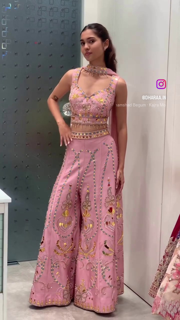 This exquisite pink co-ord set features a heavily embellished crop top and matching wide-leg sharara pants, adorned with intricate gold embroidery, beadwork, and dazzling sequins. Perfect for festive occasions, its rich detailing and contemporary silhouette offer a luxurious and modern ethnic appeal. | Video taken on: Dec 11, 2025, 6:45:22?PM UTC
