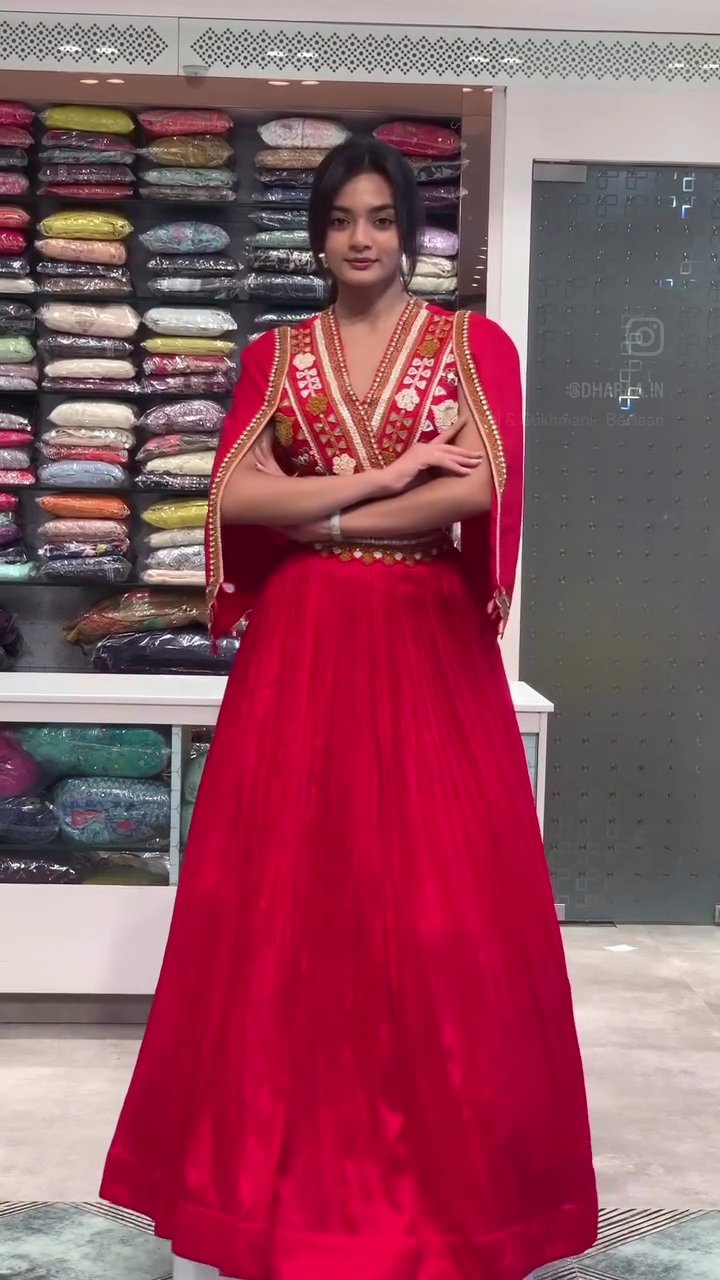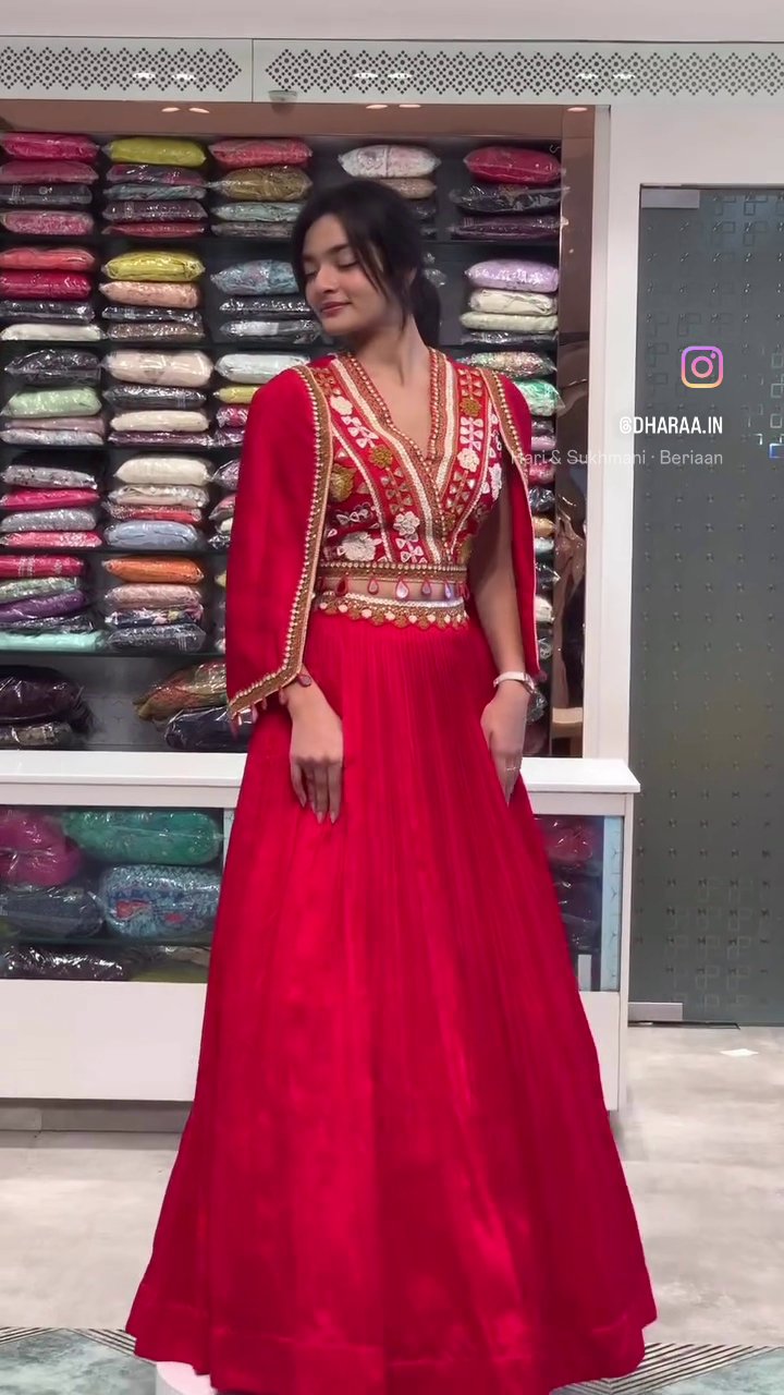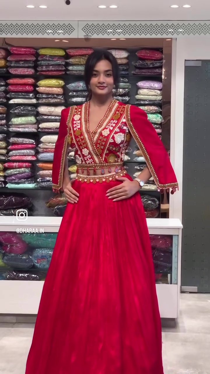 Elevate your festive wardrobe with this stunning red lehenga featuring a beautifully embroidered V-neck bodice, a unique attached cape, and an embellished waistline. Its flowing silhouette and intricate detailing make it perfect for weddings, parties, and grand celebrations. | Video taken on: Dec 11, 2025, 6:47:36?PM UTC
