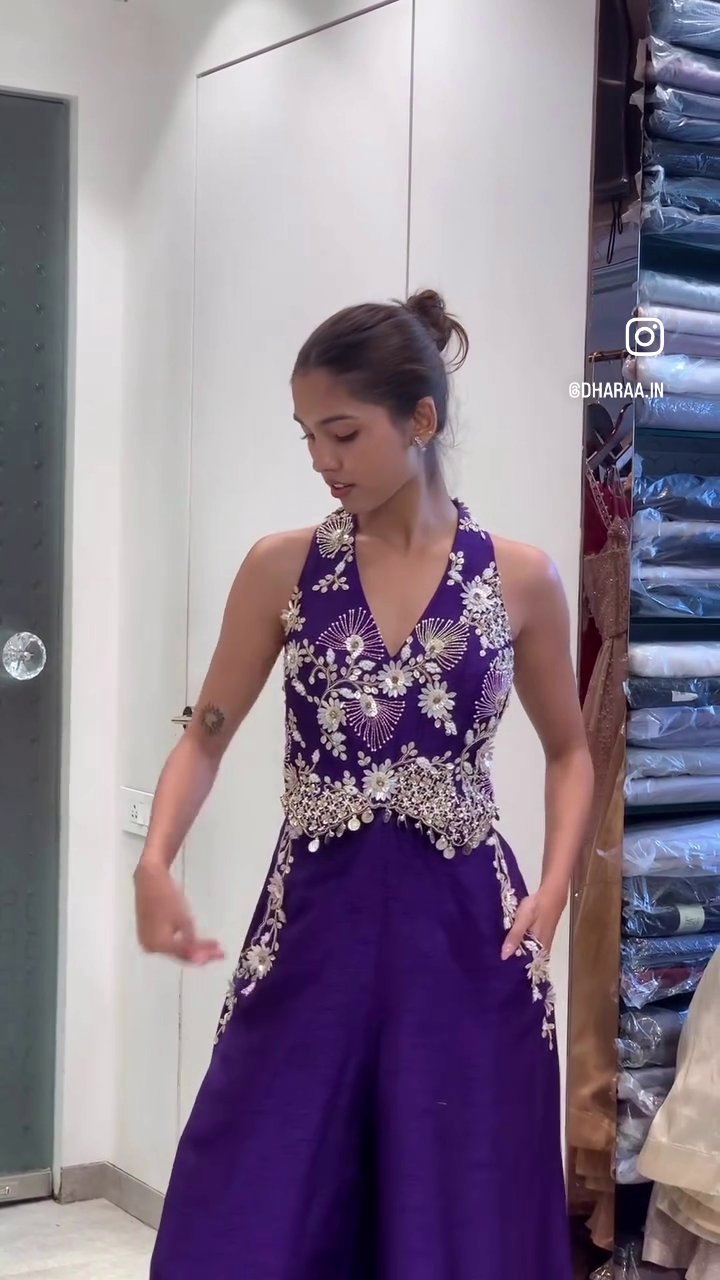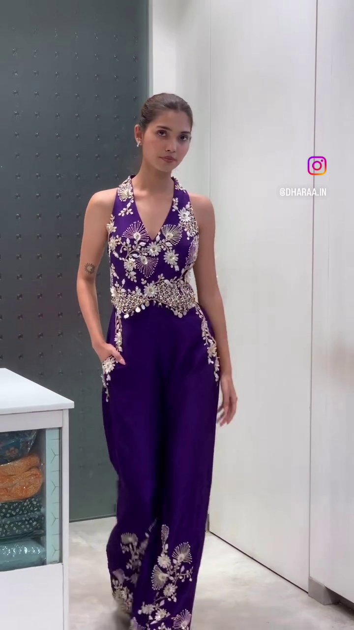 This stunning regal purple jumpsuit features an elegant halter neck and a deep V-neckline, adorned with intricate silver floral embroidery and sparkling embellishments on the bodice and waist. Its wide-legged trousers, also accented with matching embroidery, offer a comfortable yet sophisticated silhouette perfect for festive occasions. | Video taken on: Dec 11, 2025, 7:01:48?PM UTC