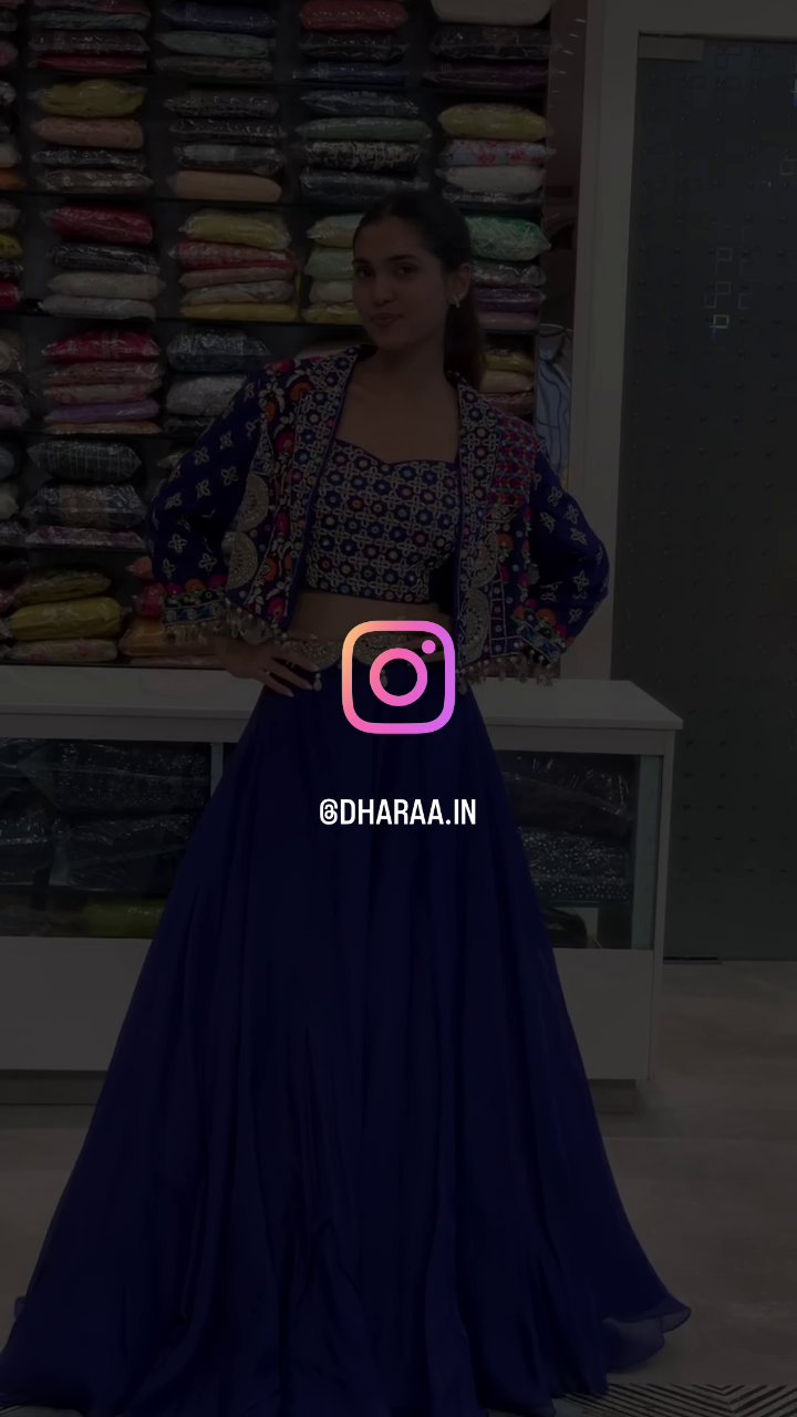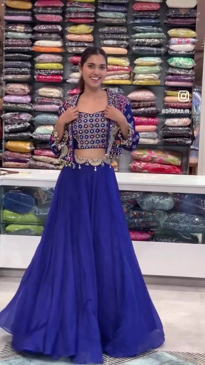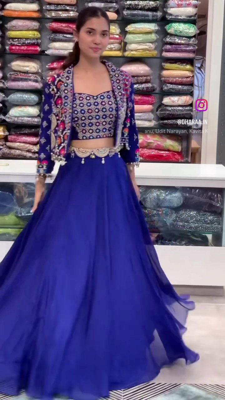 This stunning royal blue lehenga set features a crop top and matching jacket adorned with intricate embroidery, paired with a flowing, floor-length skirt. It’s perfect for festive occasions and cultural events, offering a blend of traditional craftsmanship and contemporary style. | Video taken on: Dec 11, 2025, 6:52:52?PM UTC