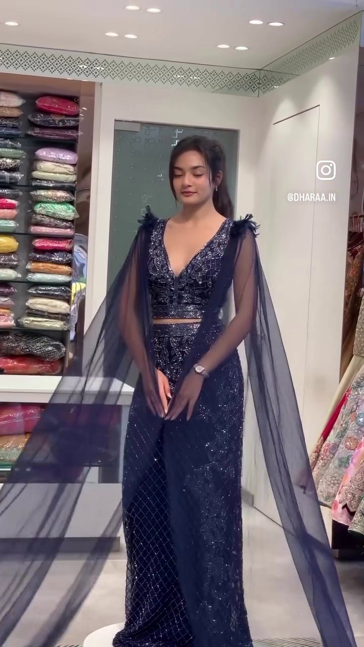 Elevate your style with this dazzling navy blue sequined jumpsuit, featuring a plunging neckline, elegant cape sleeves, and a flattering wide-leg silhouette. Perfect for making a statement at any special occasion, this ensemble combines glamour with sophisticated design. | Video taken on: Dec 11, 2025, 6:48:36?PM UTC