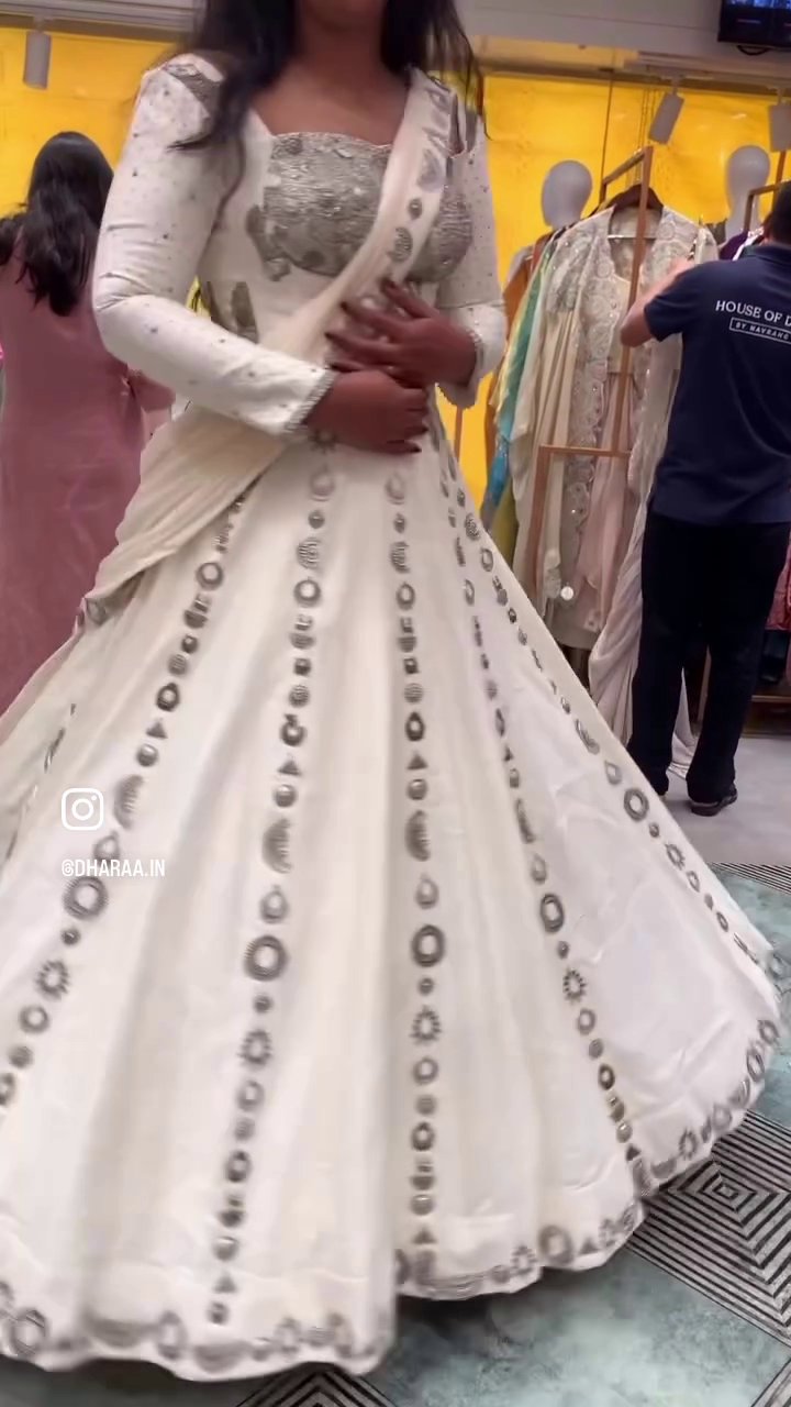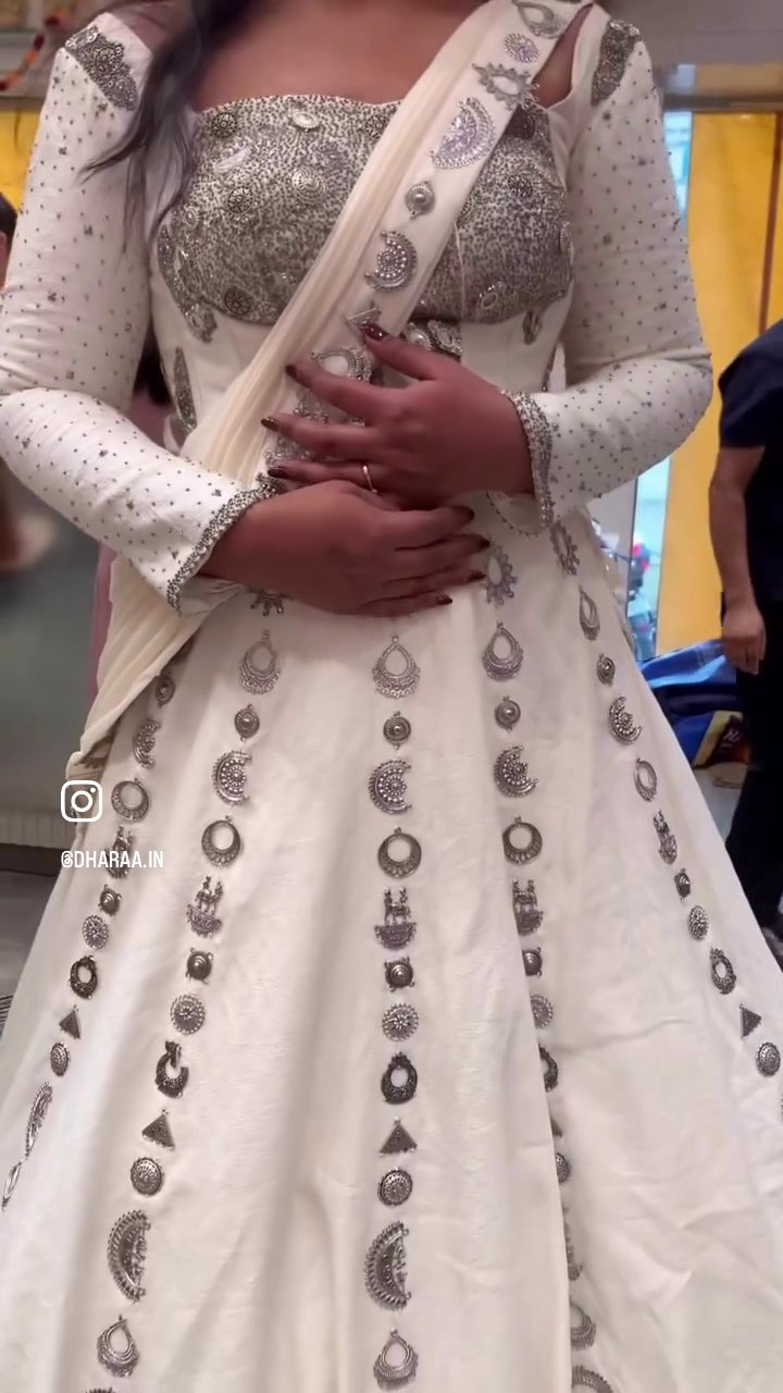 Experience timeless elegance with this stunning white gown, featuring intricate silver embellishments adorning its voluminous skirt and a sophisticated long-sleeved bodice. This beautifully crafted ensemble, complete with a graceful pre-draped element, is perfect for making a luxurious statement at any special occasion. | Video taken on: Dec 11, 2025, 6:58:34?PM UTC